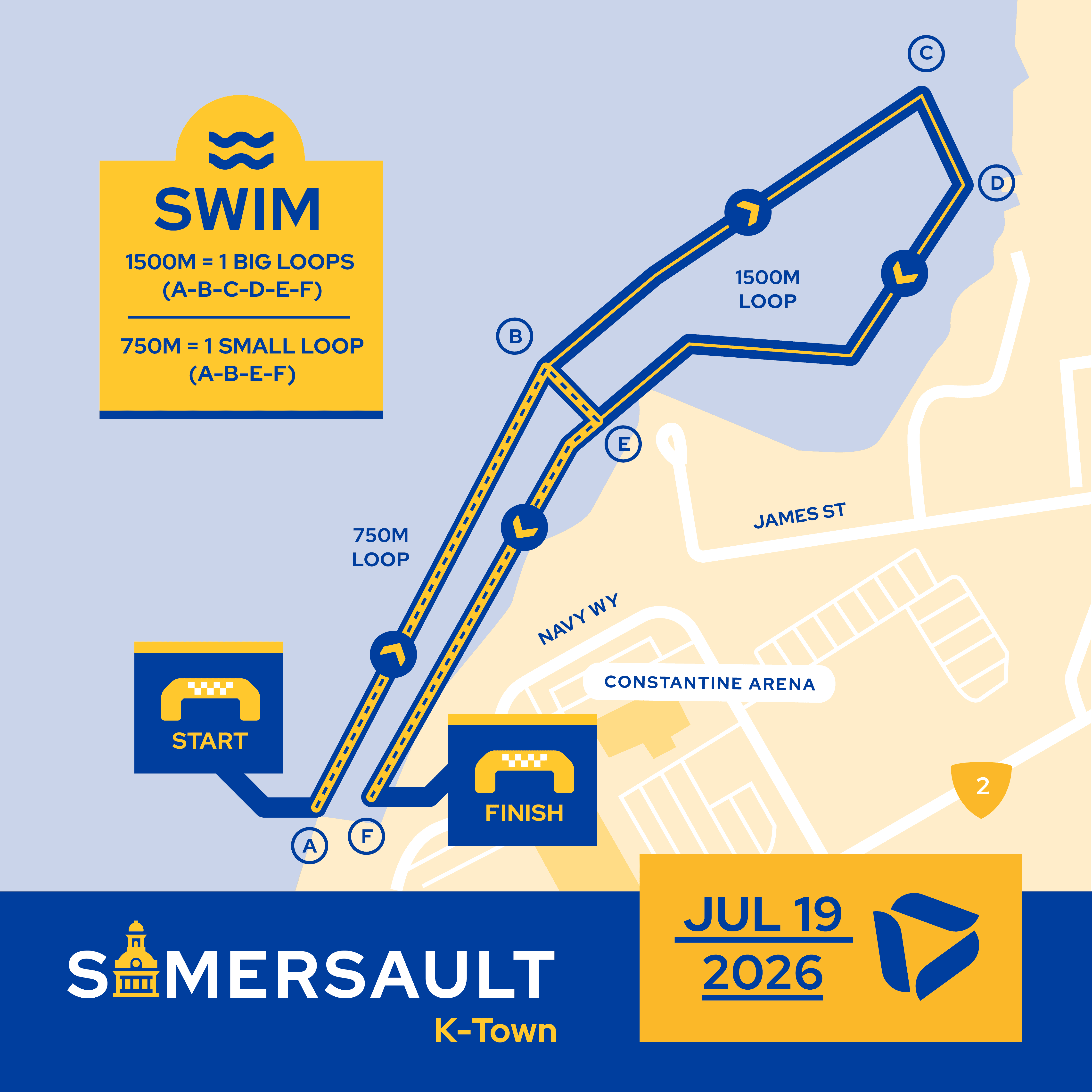 After you finish your Sprint Triathlon, you'll need to swap back into your swim gear and head back to the start line for the 10am start. If you cannot make it to the start line by 10am, you will not be eligible to start the race.